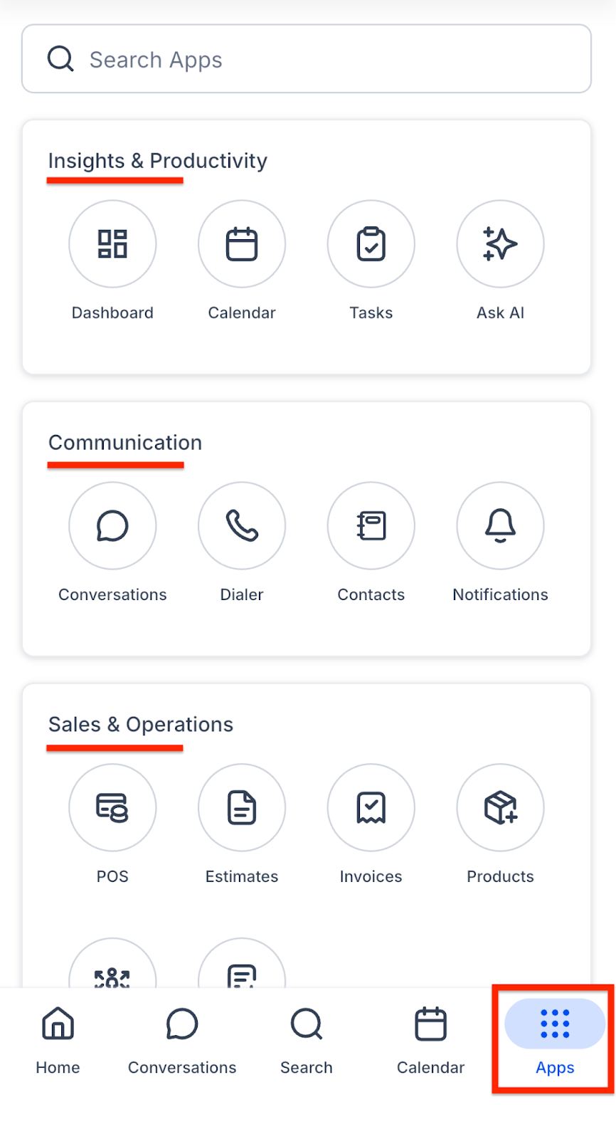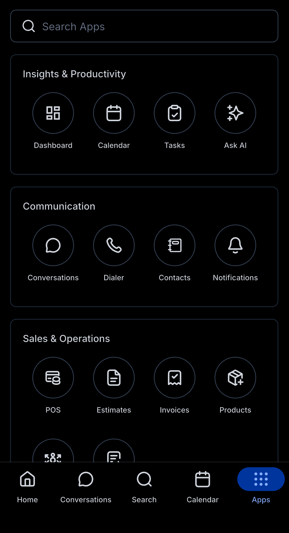 - The App Drawer keeps everything organized and easy to access. No messy menus as modules are grouped into four simple categories.