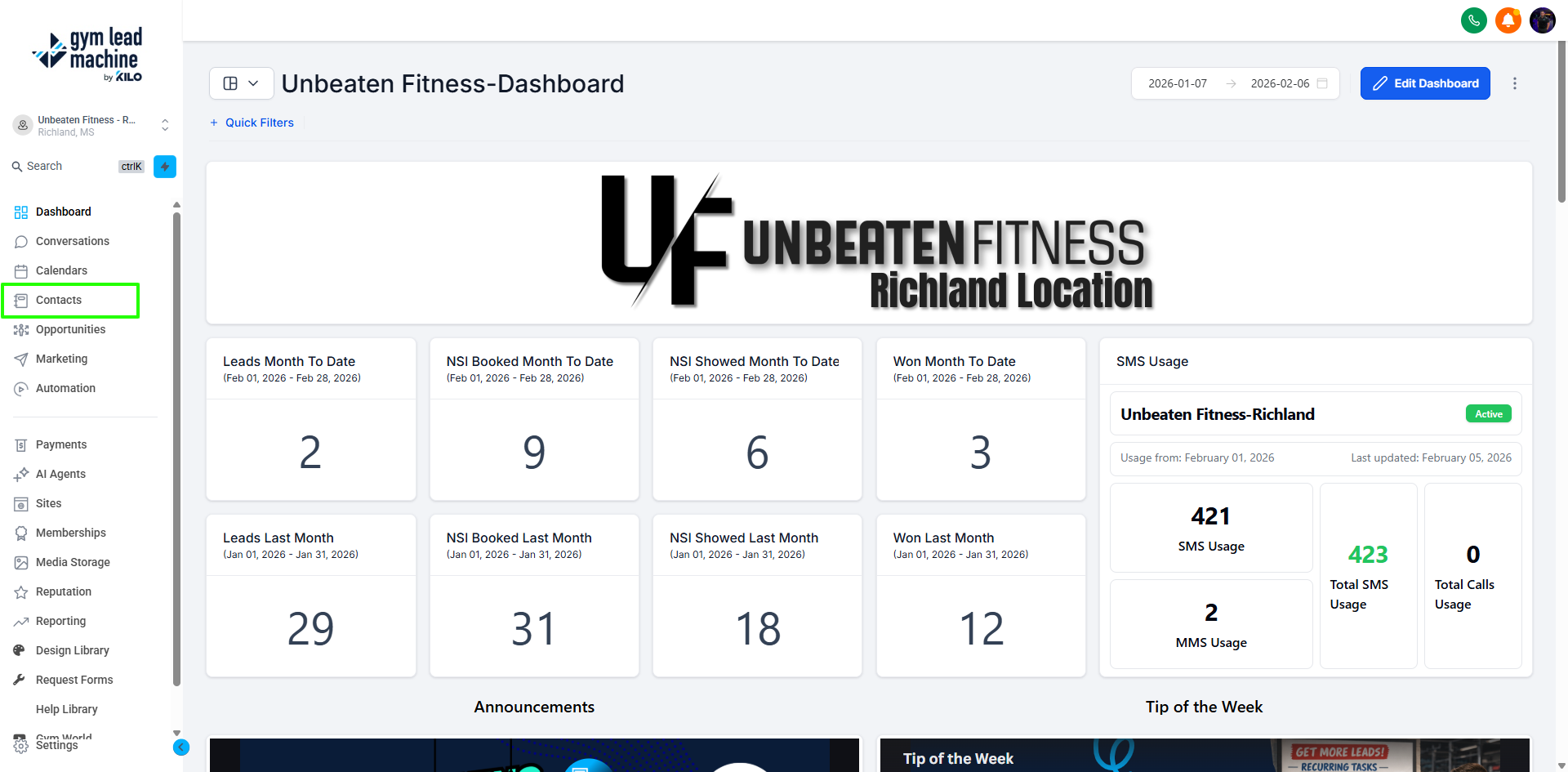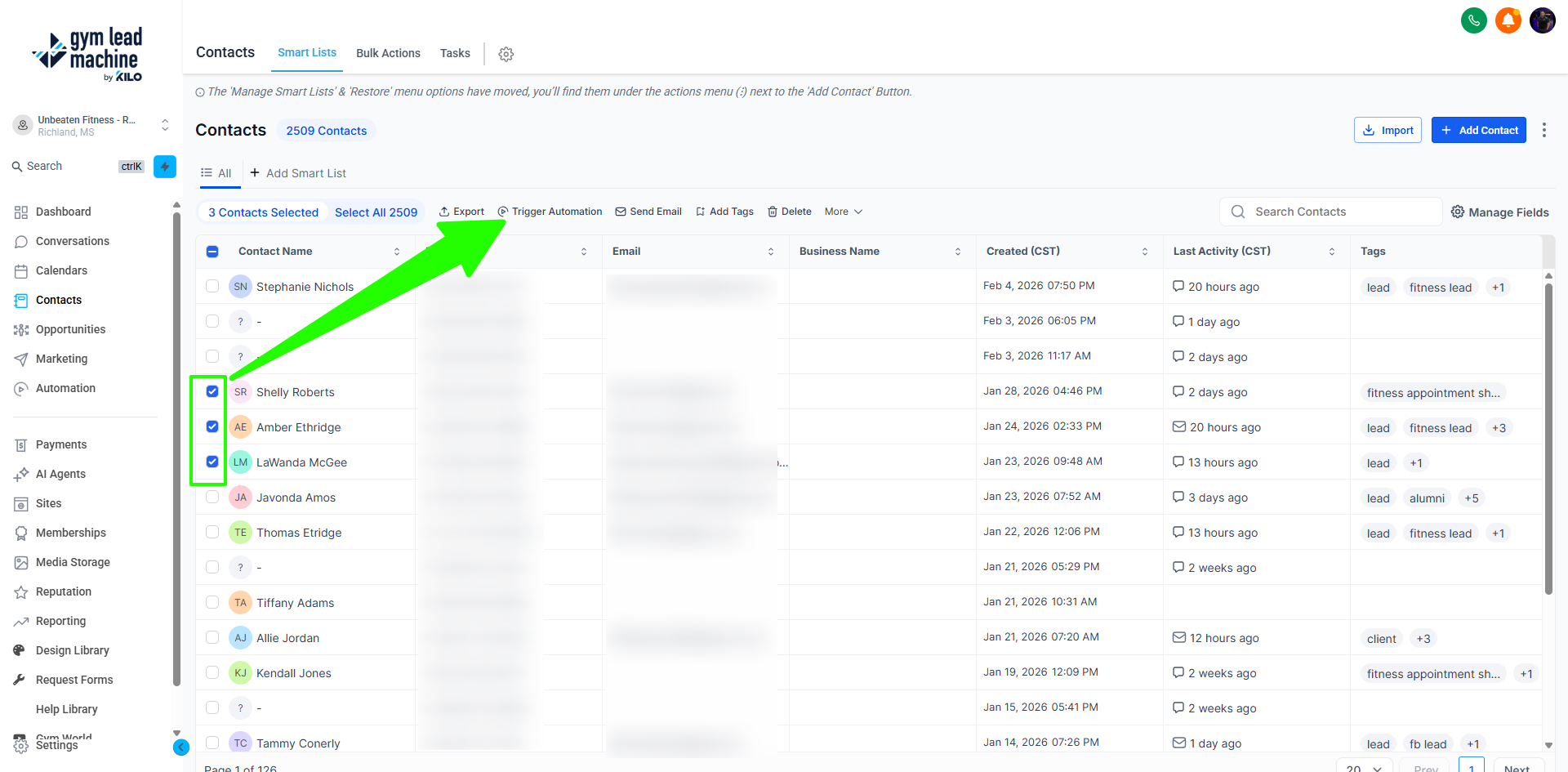 - Navigate to Contacts: Go to the Contacts section in your Gym Lead Machine (GLM) system.