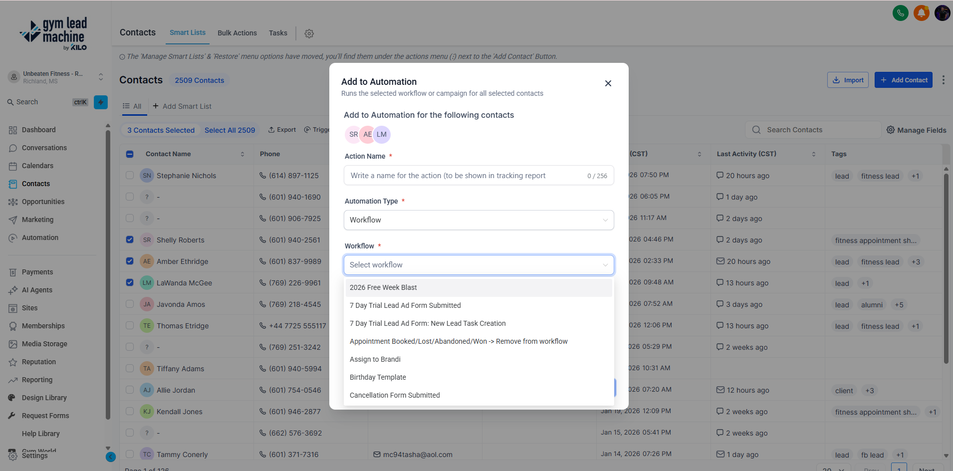 To bulk add contacts to an automation in Gym Lead Machine: