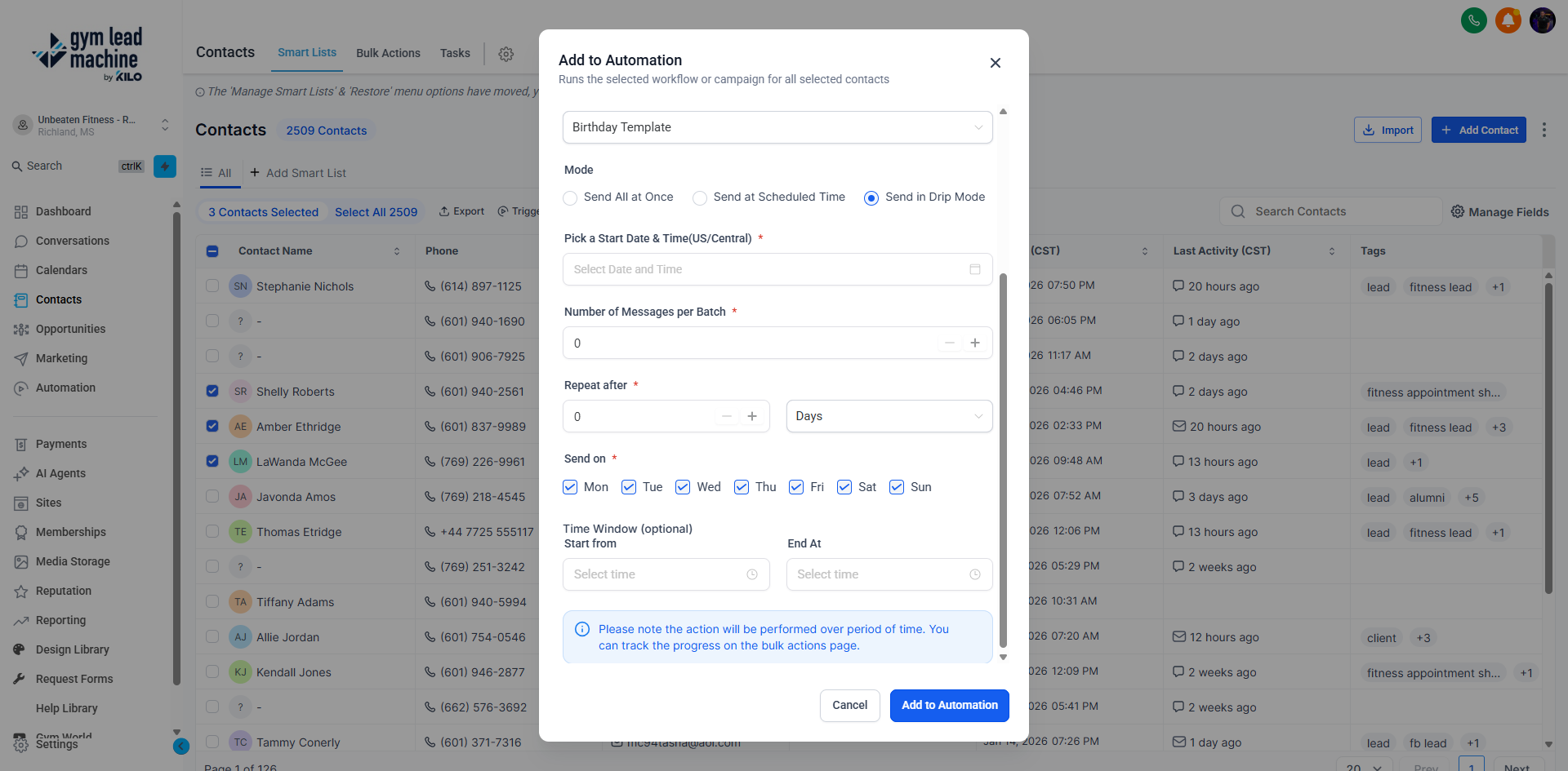 - Drip Mode: Adds contacts in batches over time. You’ll need to input: