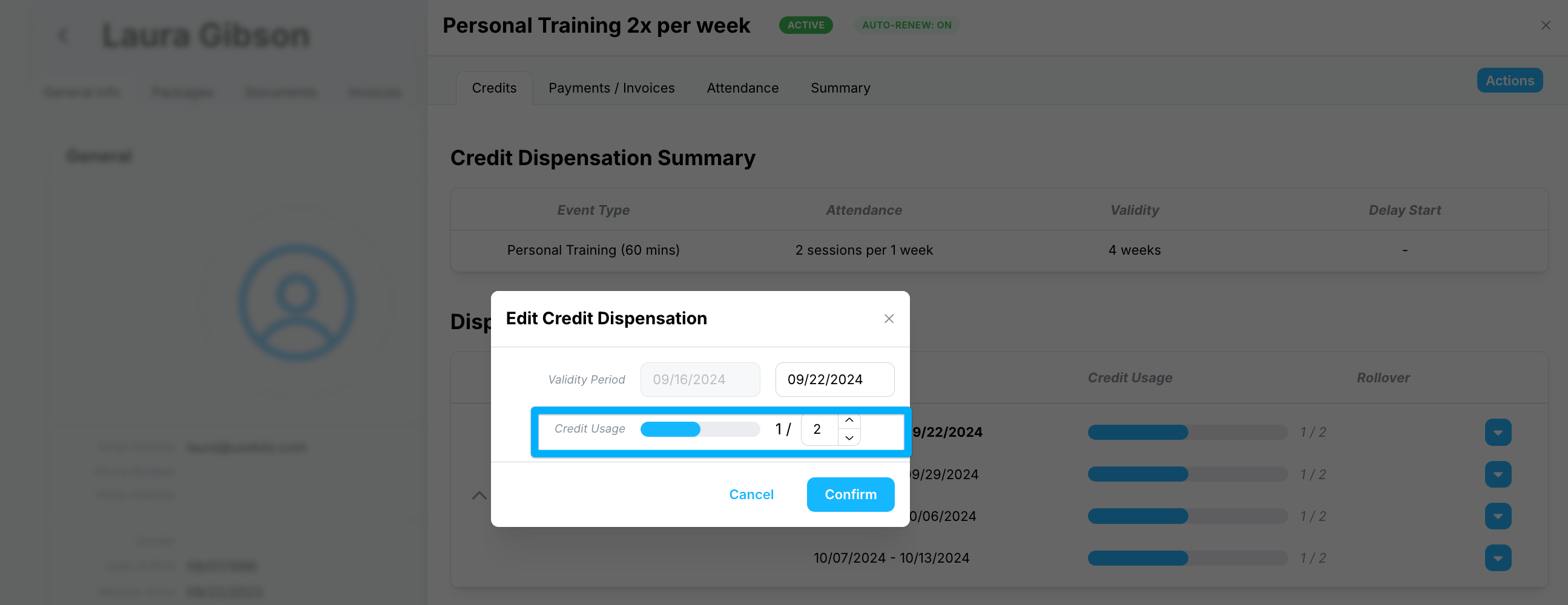 With Kilo's manual credit dispensation feature, you have enhanced flexibility for managing credit adjustments due to make-up sessions and missed appointments.