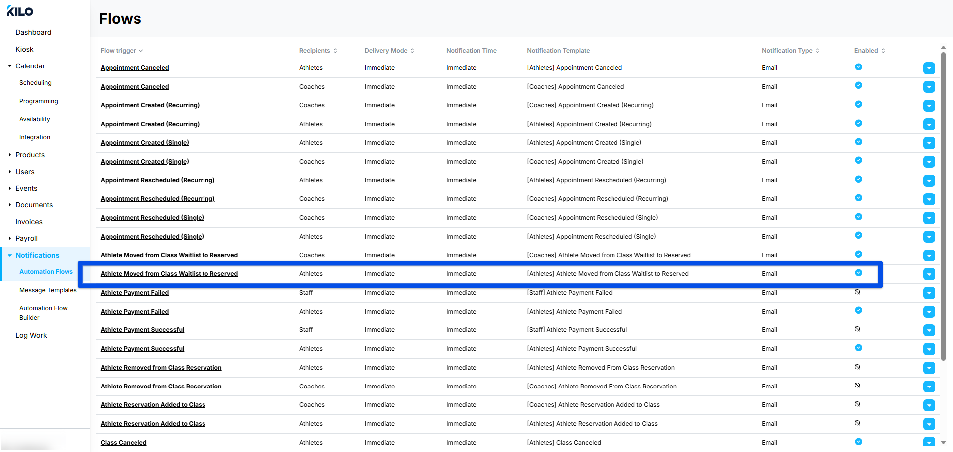 Athletes can receive an email notification when moving from the waitlist to reserved when Notifications have been enabled. To enable, go to Notifications - Automation Flow Builder - click the Blue action button - Enable. The circle will turn blue when enabled.