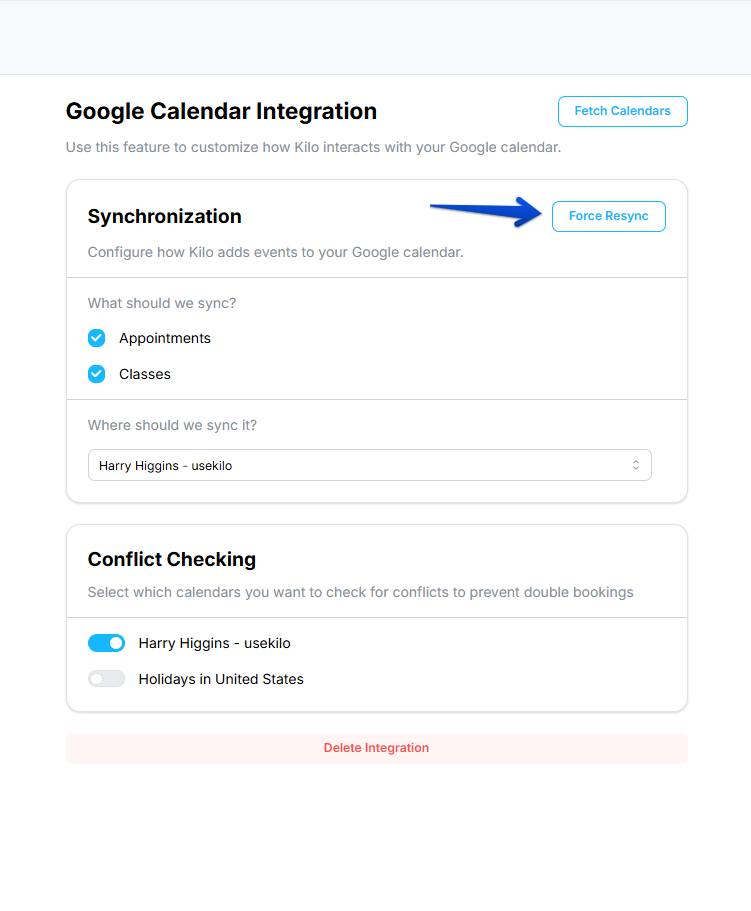 We strongly discourage using the "Delete' option if your calendar is not syncing properly, this can lead to additional issues with the integration. It is recommended to use the "Force Resync" button to fix any inconsistencies between your Kilo Calendar and your Google Calendar. In the event you are still having any issues, please reach out to hello@usekilo.com so our Support Team can assist with troubleshooting.