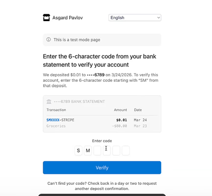- Check the bank account for a $0.01 deposit from Stripe.