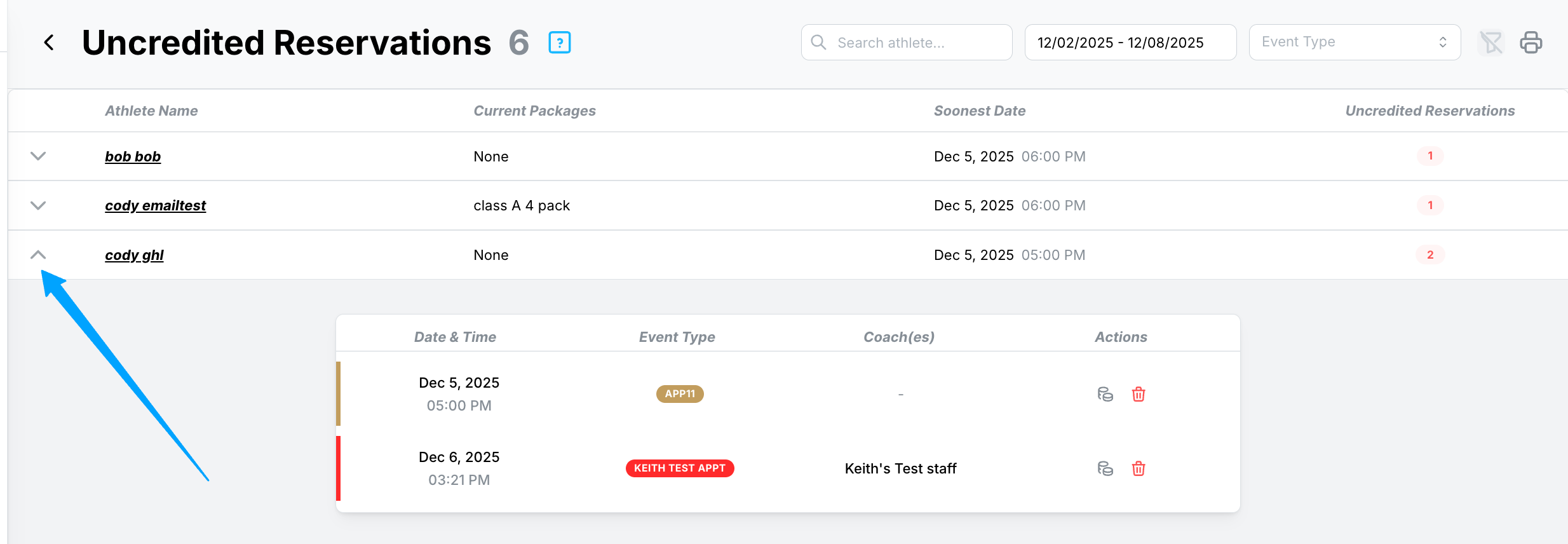 Click the down arrow to the left of each athlete’s name to expand their list of uncredited reservations and take any needed actions.