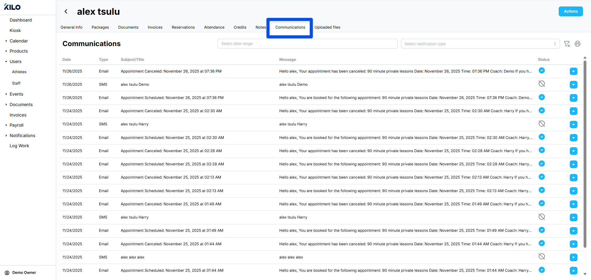 provide transparency for staff and owners about communications triggered by Kilo GMS and confirm interactions without leaving the athlete’s profile.
