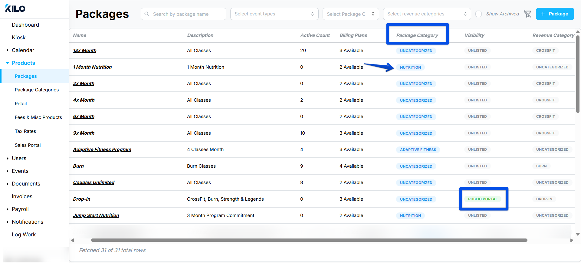 Plus, the new Visibility column gives you an at-a-glance view of where each package appears (Sales Portal and/or Athlete App) and whether it’s available for purchase based on its Billing Plan settings (Public or Private).