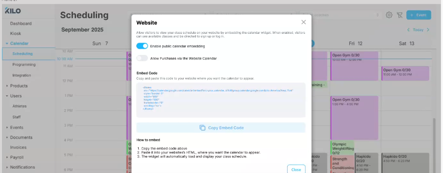 We’re excited to introduce a highly anticipated feature that allows you to embed your Kilo GMS class calendar directly into your website. 🎉