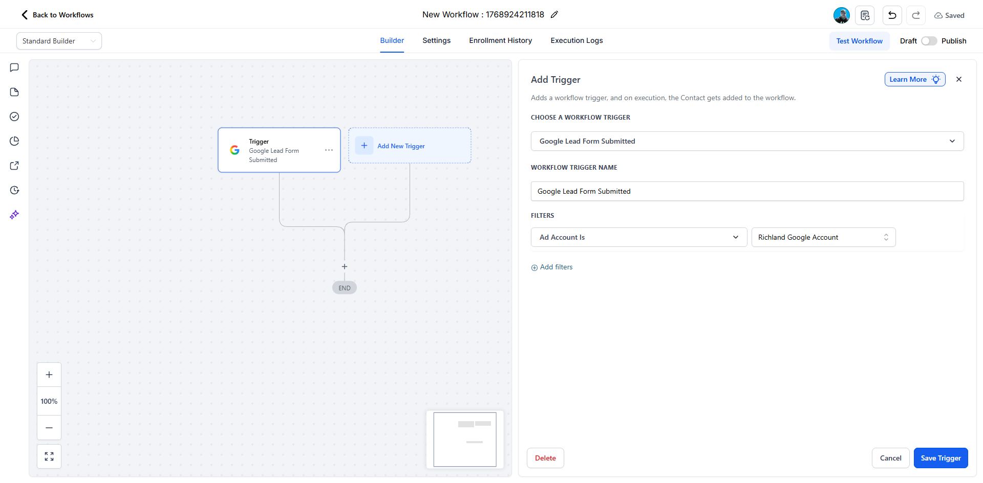 Select the trigger “Google Lead Form Submitted” to build automations that engage leads the moment they come in.