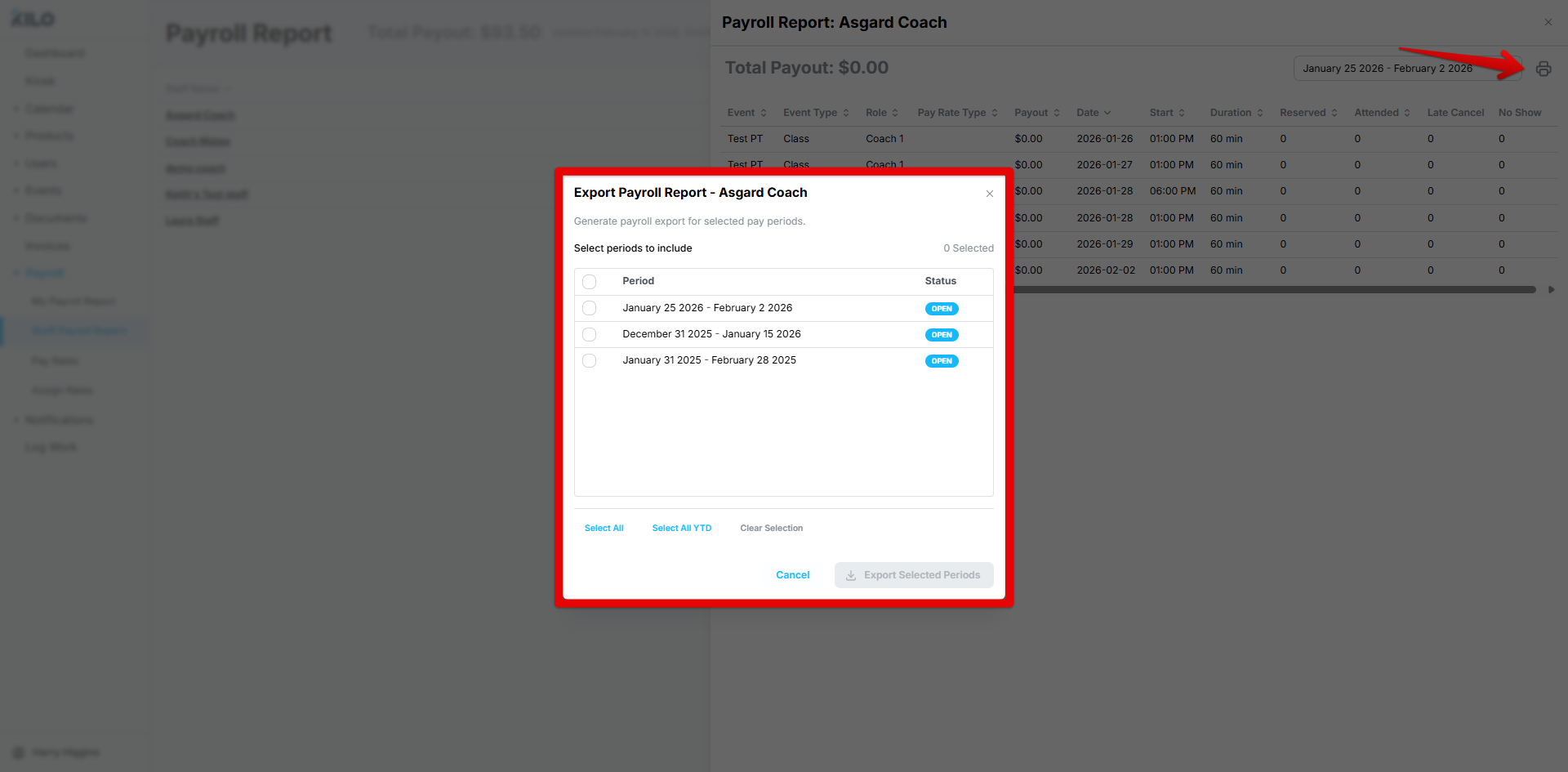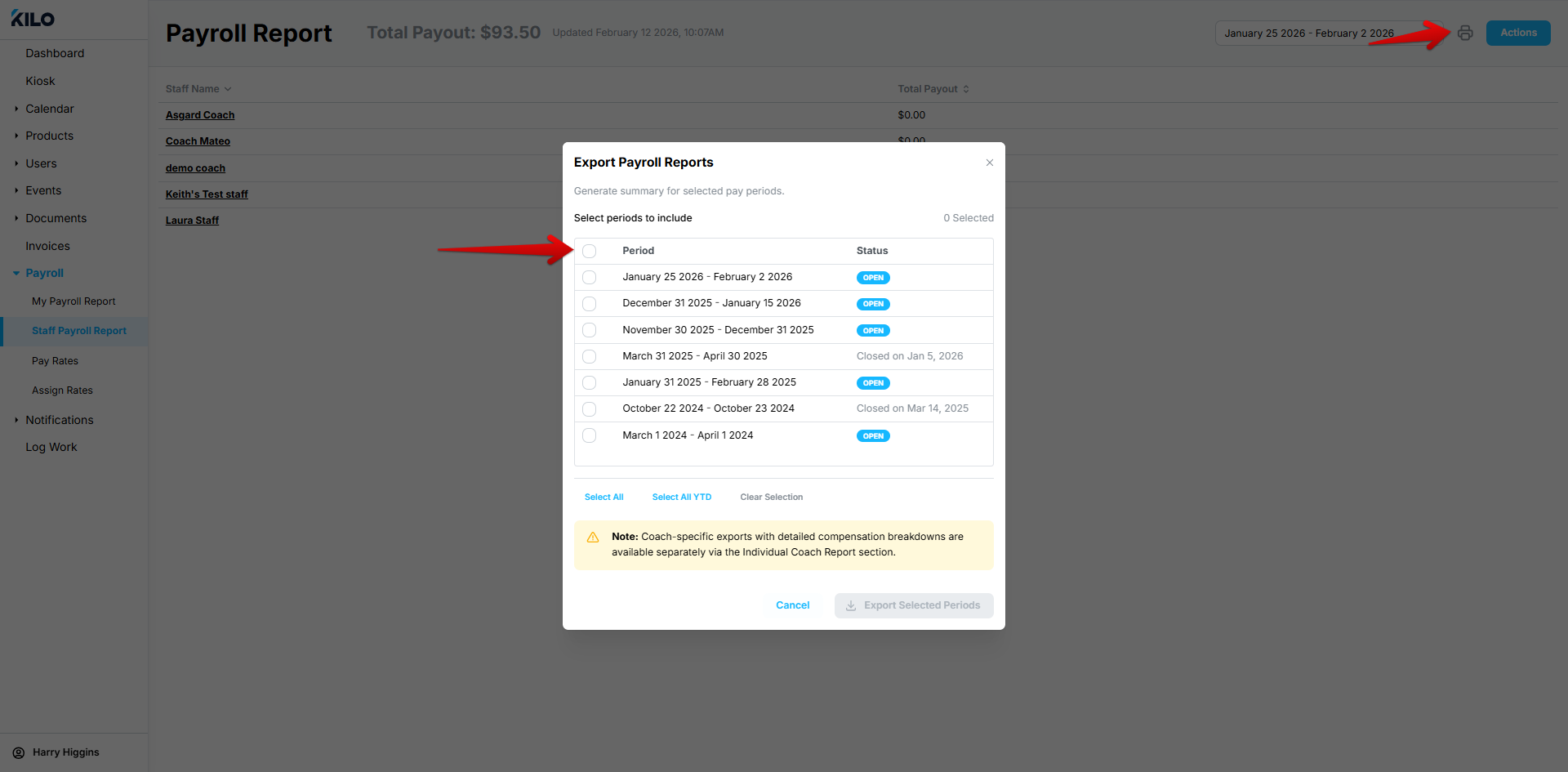 Note: Coach-specific exports with detailed compensation breakdowns are available separately via the Individual Coach Report section.